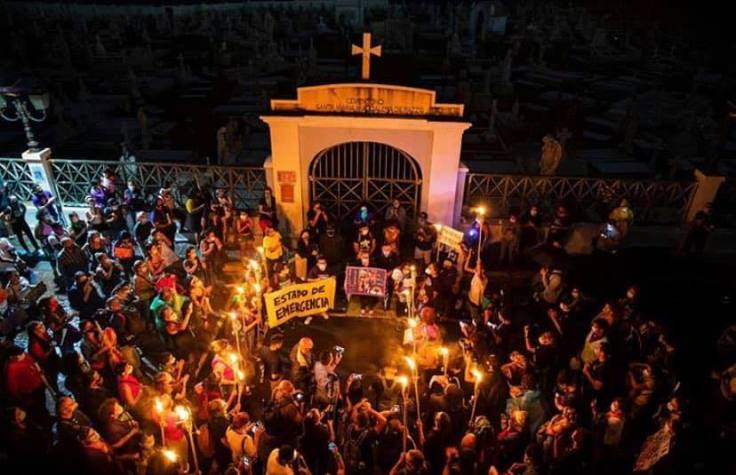 Under the rain and at the edge of dusk, dozens of torches illuminated the left side of the Santa María Magdalena de Pazzi cemetery, in Old San Juan. There, a crowd of people, mostly young people, took to the streets today to demand from the government, once again, a declaration of a state of emergency due to gender violence in the country.